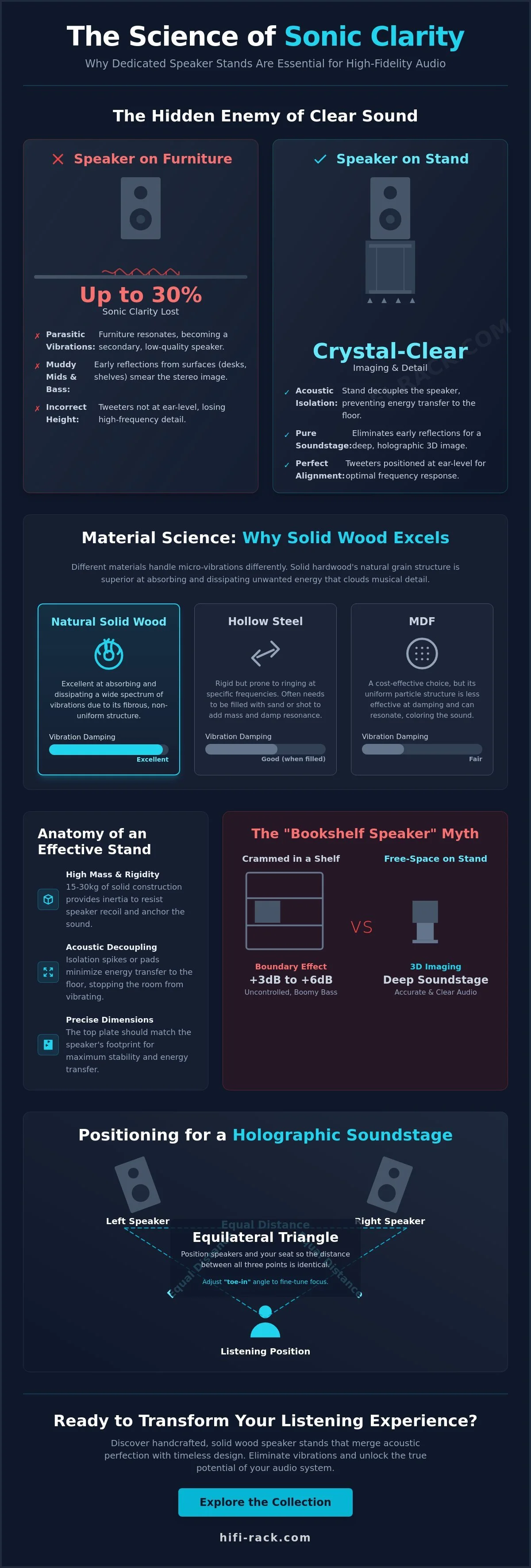 Choosing the best speaker stands isn't a matter of interior design; it's a fundamental requirement for high-fidelity performance. When you place a high-end monitor on a desk or a standard sideboard, you're compromising the integrity of the signal. The flat surface creates immediate acoustic reflections. These early reflections arrive at your ears only 2 to 5 milliseconds after the direct sound, causing phase interference that muddies the mid-range and smears the stereo image.
